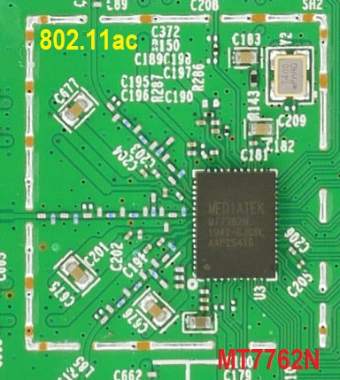 Роль микросхем реализующих WiFi заняли так же решения от MediaTek. Это чипы MT7761N — реализует WiFi-4 (2.4 ГГц) и MT7762N — реализует WiFi-5 (5 ГГц). Оба решения аппаратно поддерживают современные технологии, в том числе MU-MIMO. Модули представленны ниже на фото: